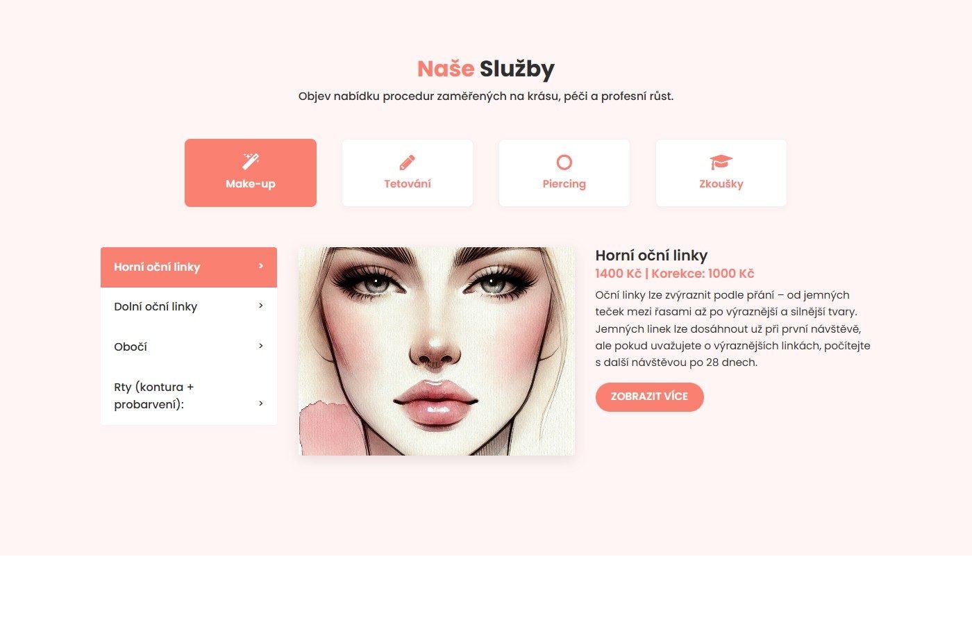 Web je postaven jako moderní single-page aplikace ve Vue.js s přehledným katalogem služeb včetně ceníku, galerií realizovaných prací a kontaktní sekcí s mapou a QR kódem pro rychlý přístup. Design v teplých lososových tónech odpovídá brandingu studia.