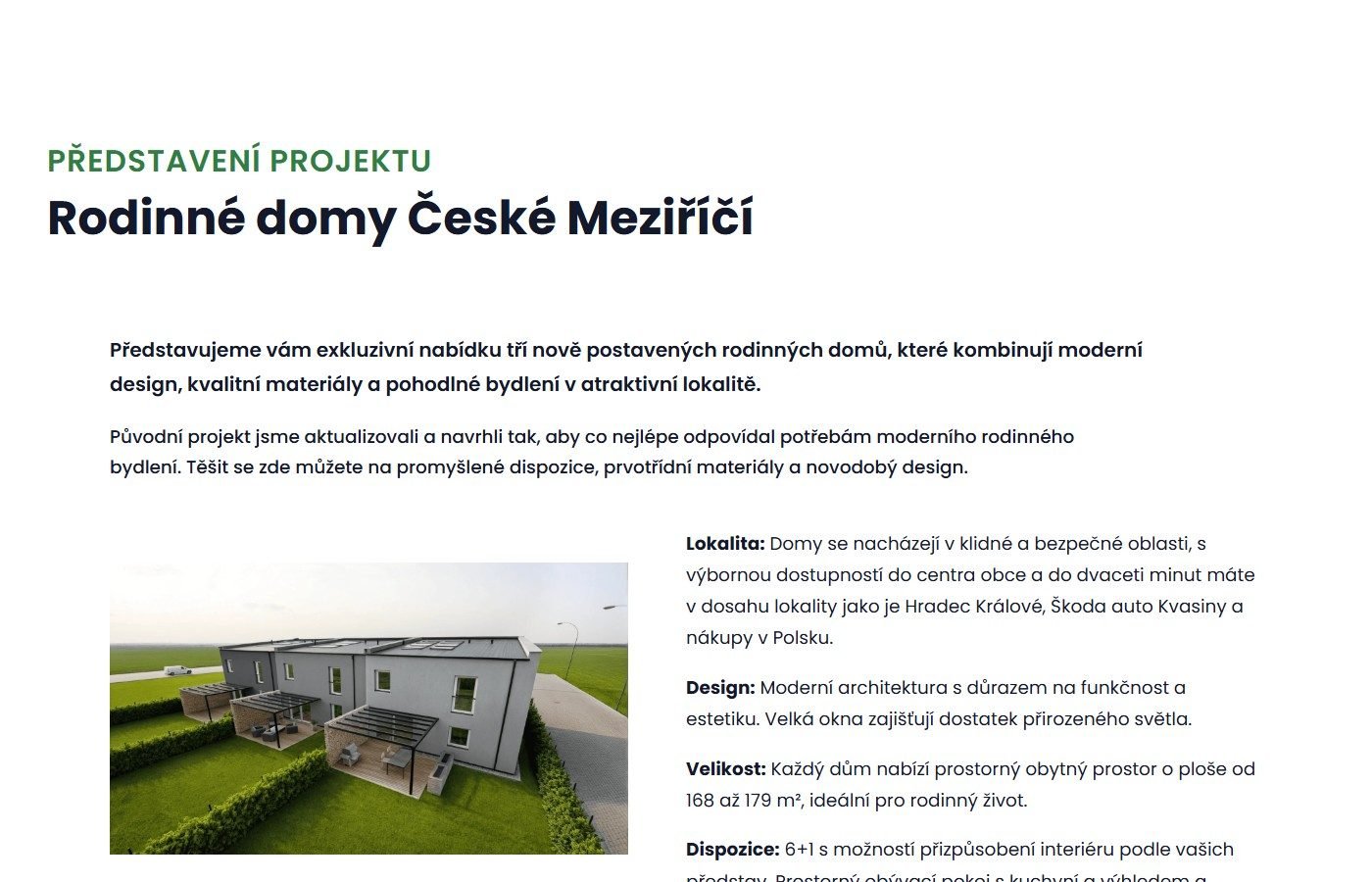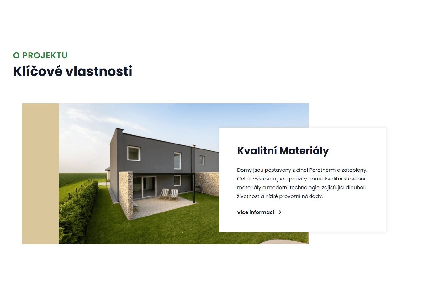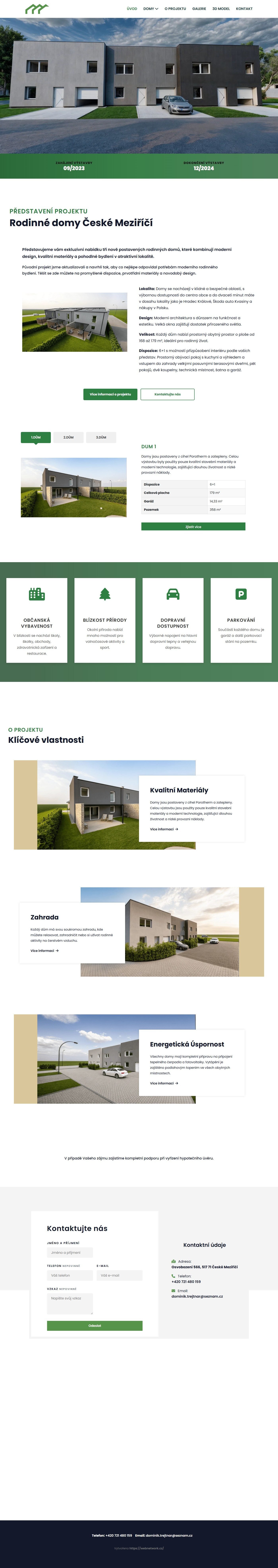 Web obsahuje interaktivní přehled jednotlivých domů s detailními parametry (dispozice, plocha, garáž, pozemek), sekci O projektu s klíčovými vlastnostmi (kvalitní materiály Porotherm, energetická úspornost, moderní architektura), fotogalerii a integrovaný 3D BIM model pro virtuální prohlídku.