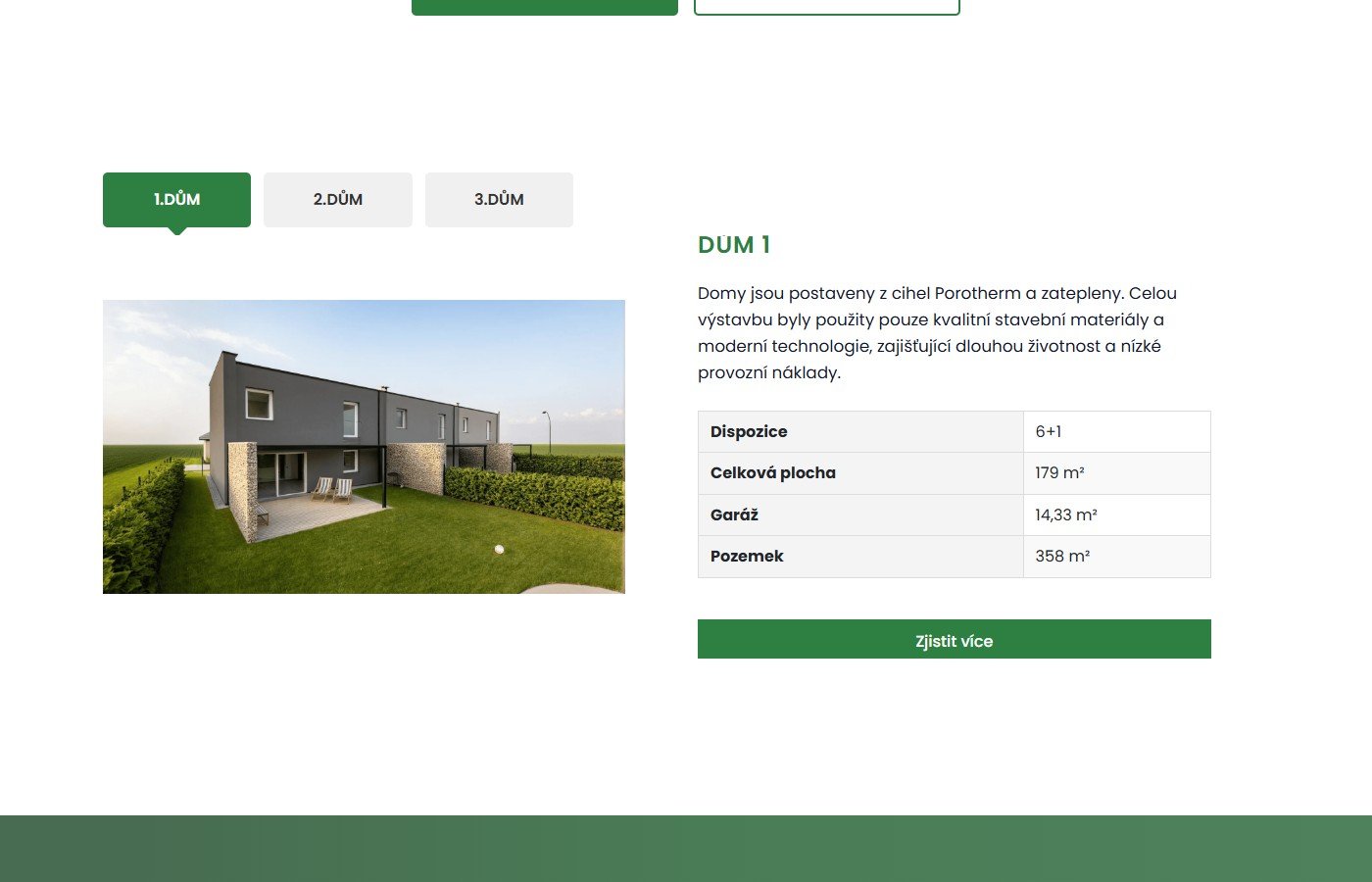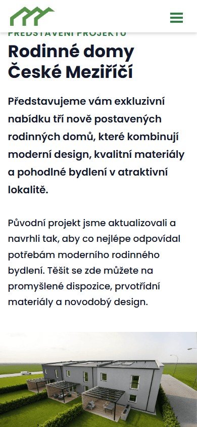 Prezentační web pro developerský projekt Tři Domy v České Meziříčí. Stránka nabízí kompletní informace o třech nově postavených řadových rodinných domech s dispozicí 6+1 a plochou 168–179 m².