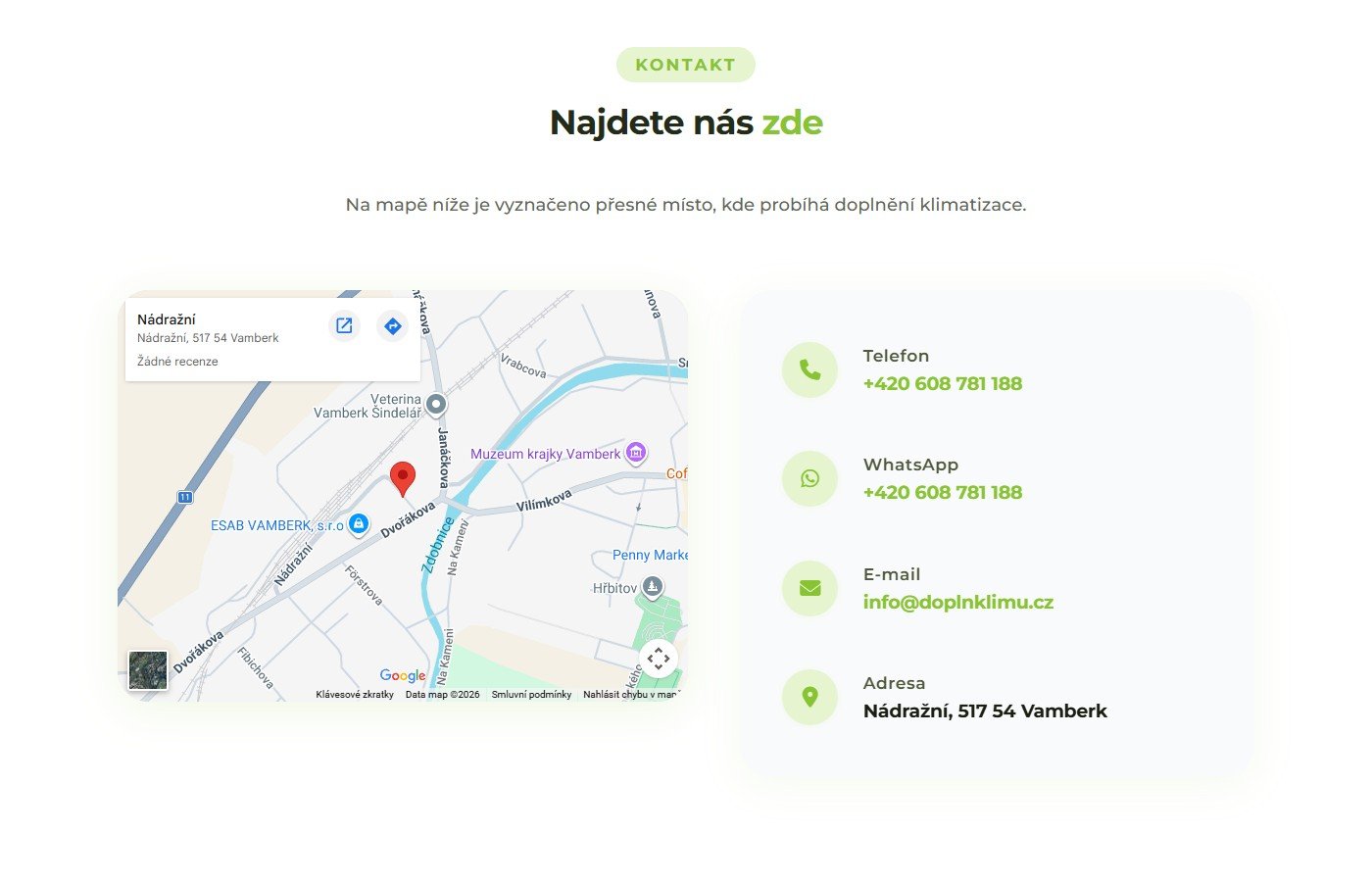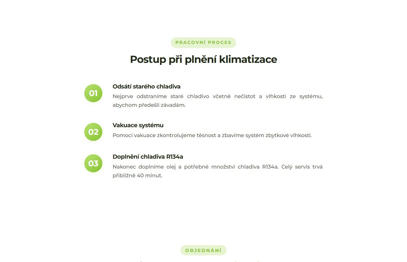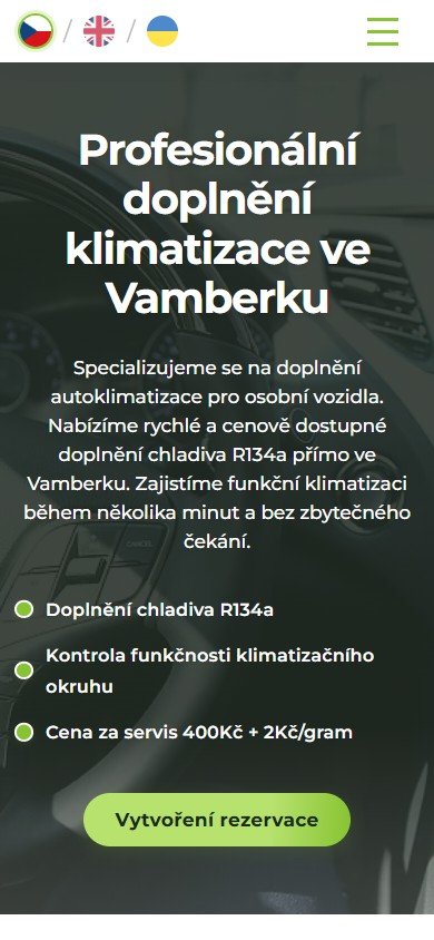 Prezentační web pro službu profesionálního doplnění autoklimatizace ve Vamberku. Stránka obsahuje přehledný popis služby s ceníkem (400 Kč + 2 Kč/gram chladiva R134a), trojkrokový pracovní postup (odsátí, vakuace, doplnění) a interaktivní online rezervační systém.