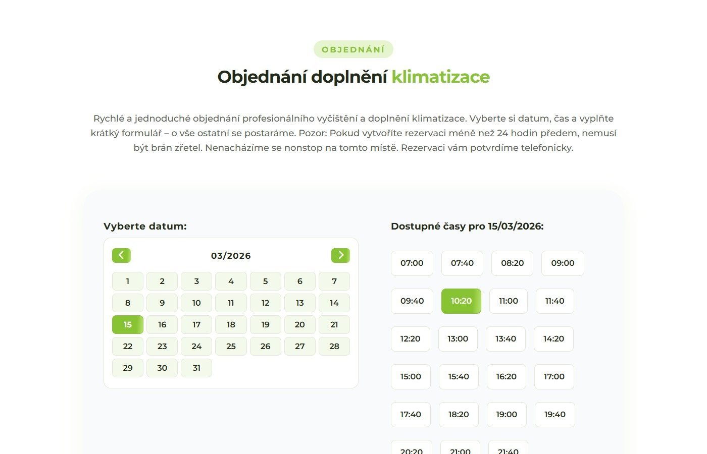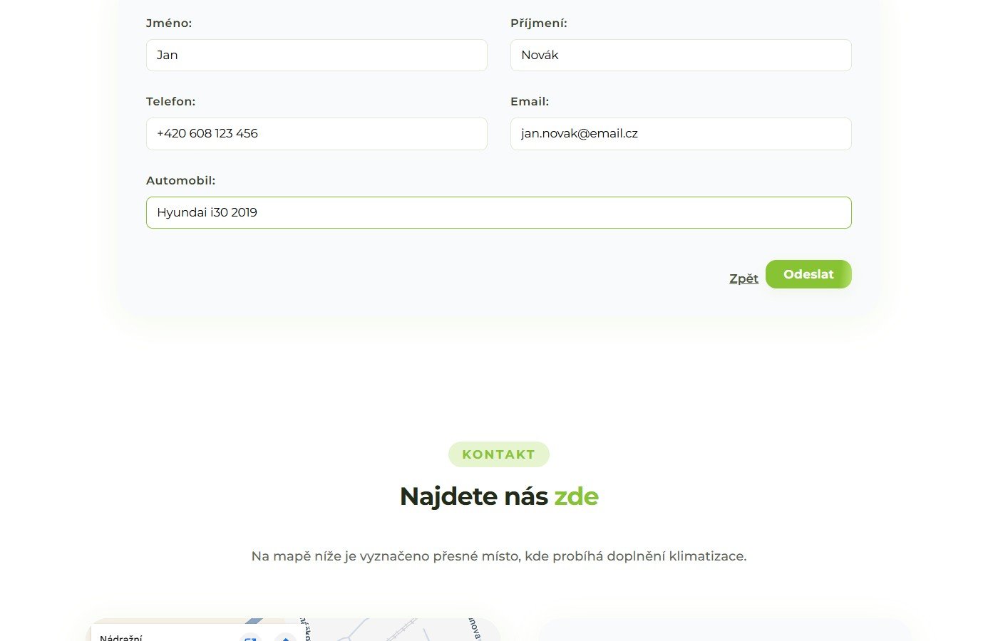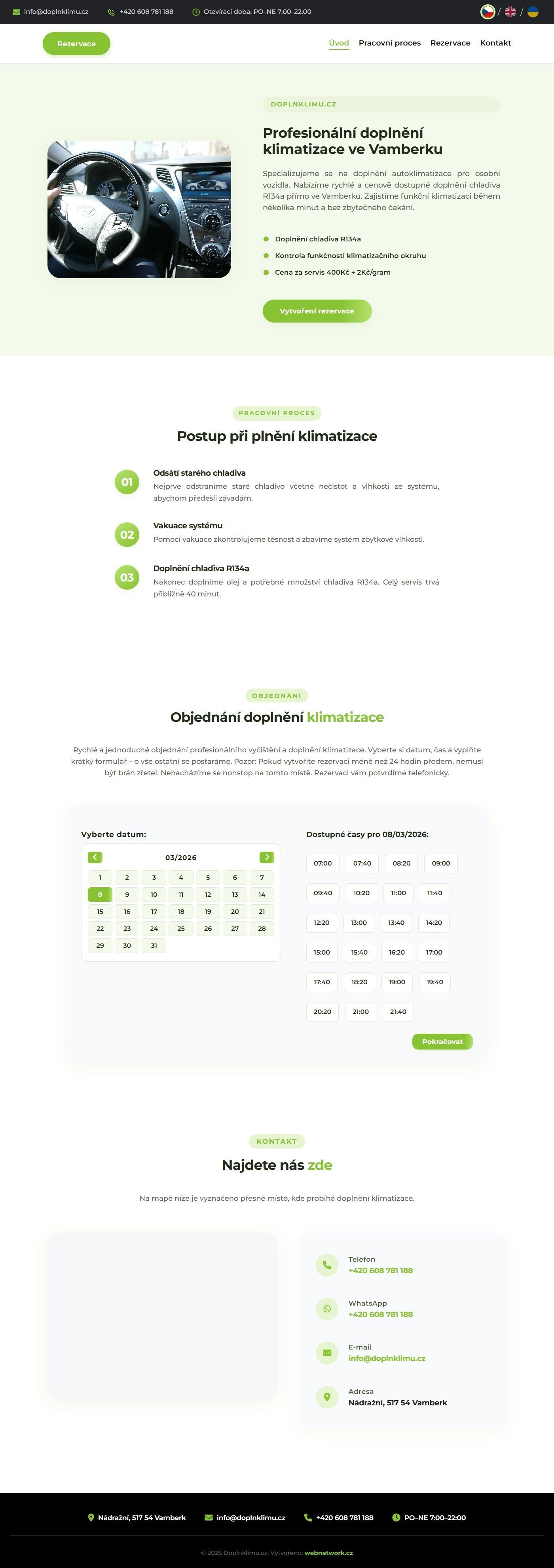 Rezervační systém umožňuje výběr data z kalendáře a dostupného časového slotu s krokem 40 minut. Po výběru termínu zákazník vyplní kontaktní údaje (jméno, příjmení, telefon, e-mail, automobil). Součástí je kontaktní sekce s Google Maps, telefonem, WhatsApp a e-mailem.