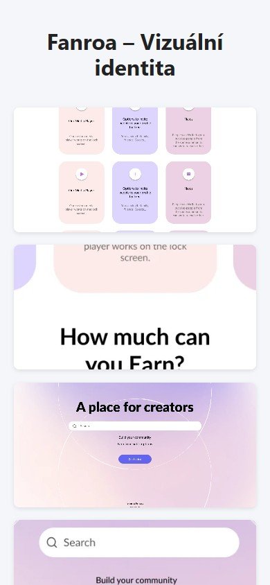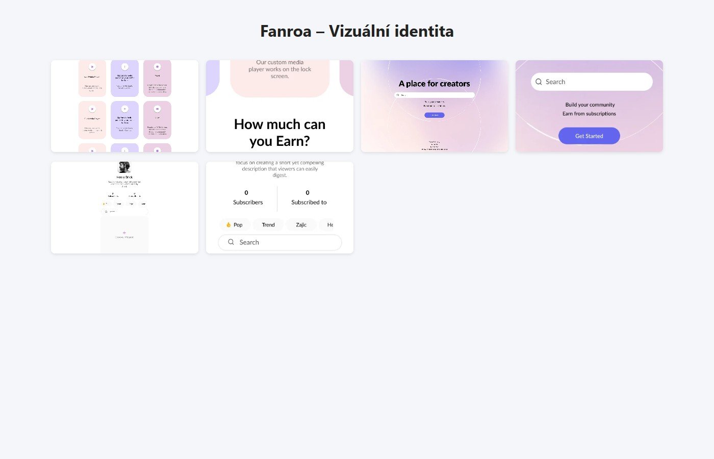 Kompletní vizuální identita a UI/UX design pro sociální platformu Fanroa zaměřenou na tvůrce obsahu s předplatitelským modelem. Projekt zahrnuje návrh klíčových obrazovek v desktopové i mobilní verzi.