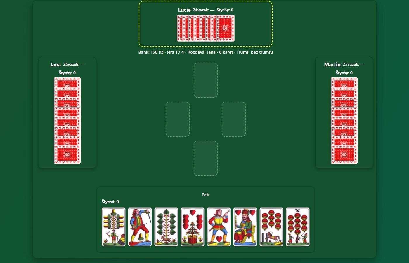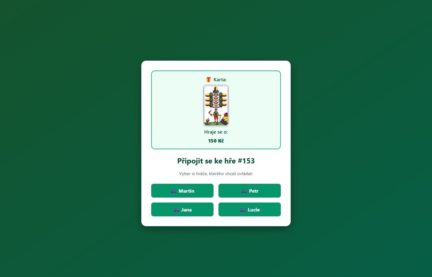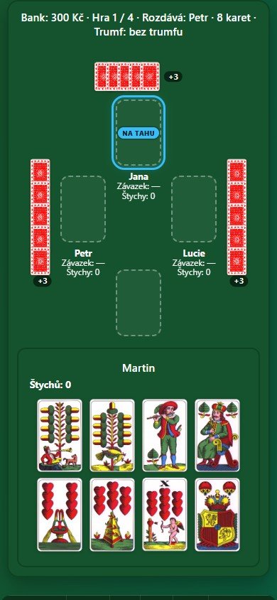 Webová multiplayerová karetní hra s tradičními českými kartami (32 karet). Hra je určena pro 4 hráče, kteří se připojí přes sdílený odkaz — každý ovládá svého hráče na vlastním zařízení.
