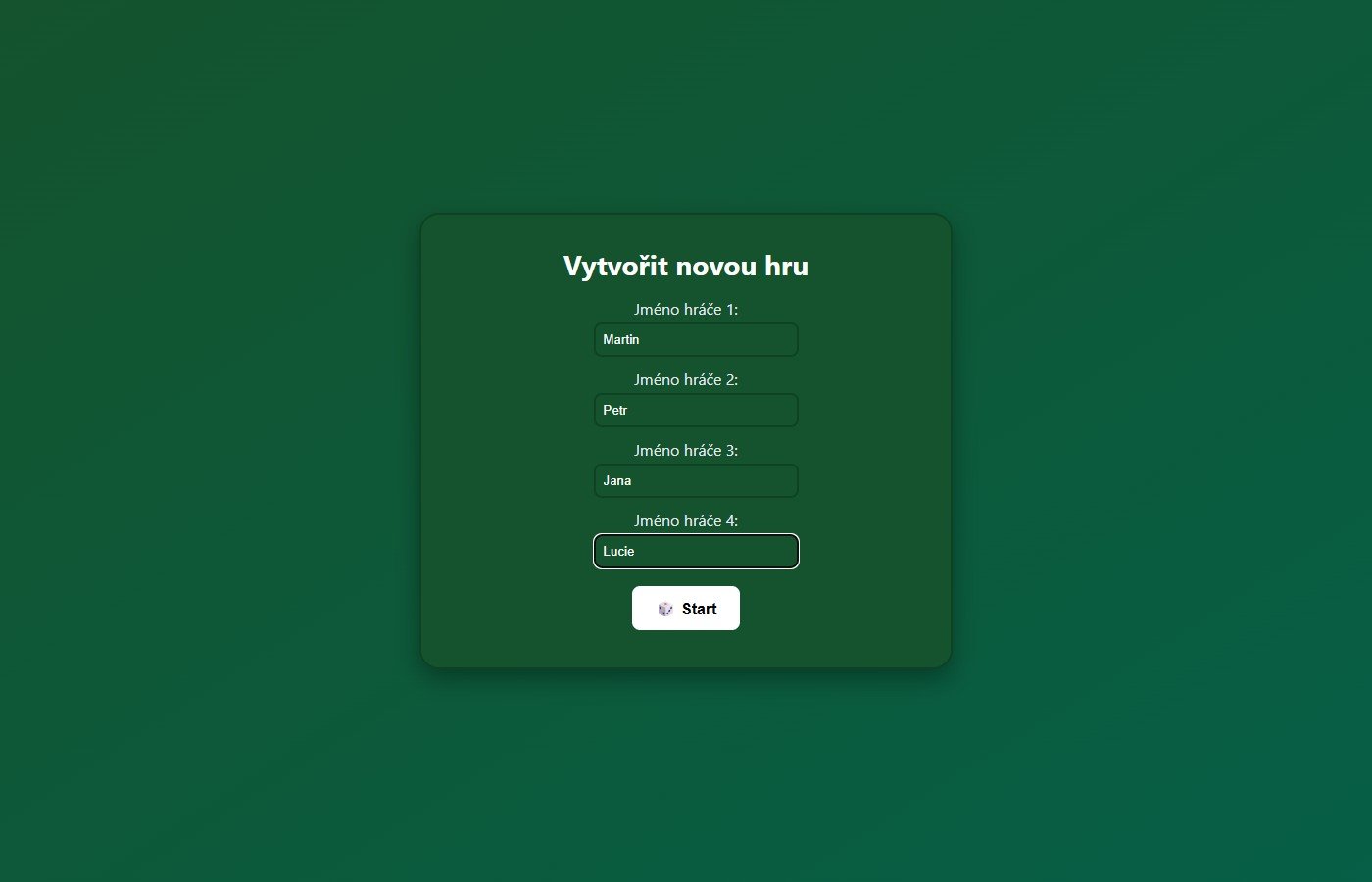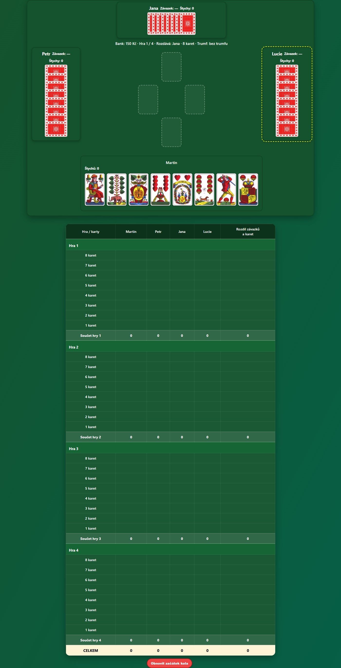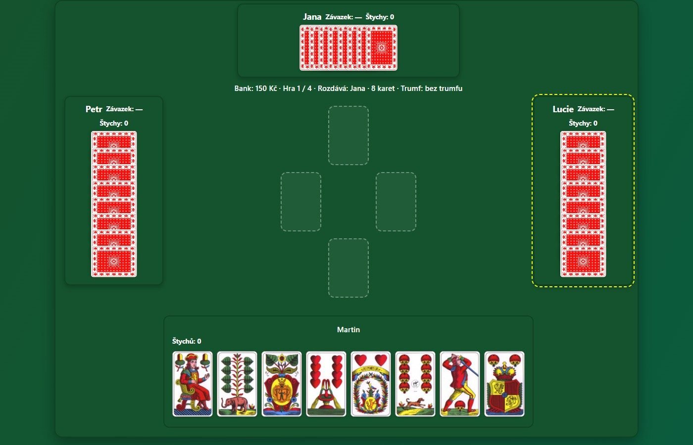 Webová multiplayerová karetní hra s tradičními českými kartami (32 karet). Hra je určena pro 4 hráče, kteří se připojí přes sdílený odkaz — každý ovládá svého hráče na vlastním zařízení.